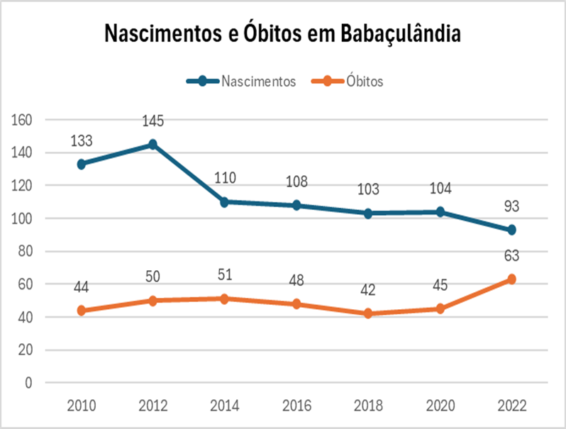 Com um crescimento populacional de aproximadamente 1% entre 2000 e 2010 e um declínio de 24,6% entre 2010 e 2022, o crescimento negativo pode ser atribuído à emigração, sendo influenciado diretamente pela construção da Usina Hidrelétrica de Estreito-Maranhão, que impactaram a dinâmica demográfica da região. Apresentamos o Gráfico 2 que mostra os dados de nascimentos e de óbitos nos últimos 12 anos em Babaçulândia, segundo os dados do IBGE (2022) e do DATASUS (2022):
