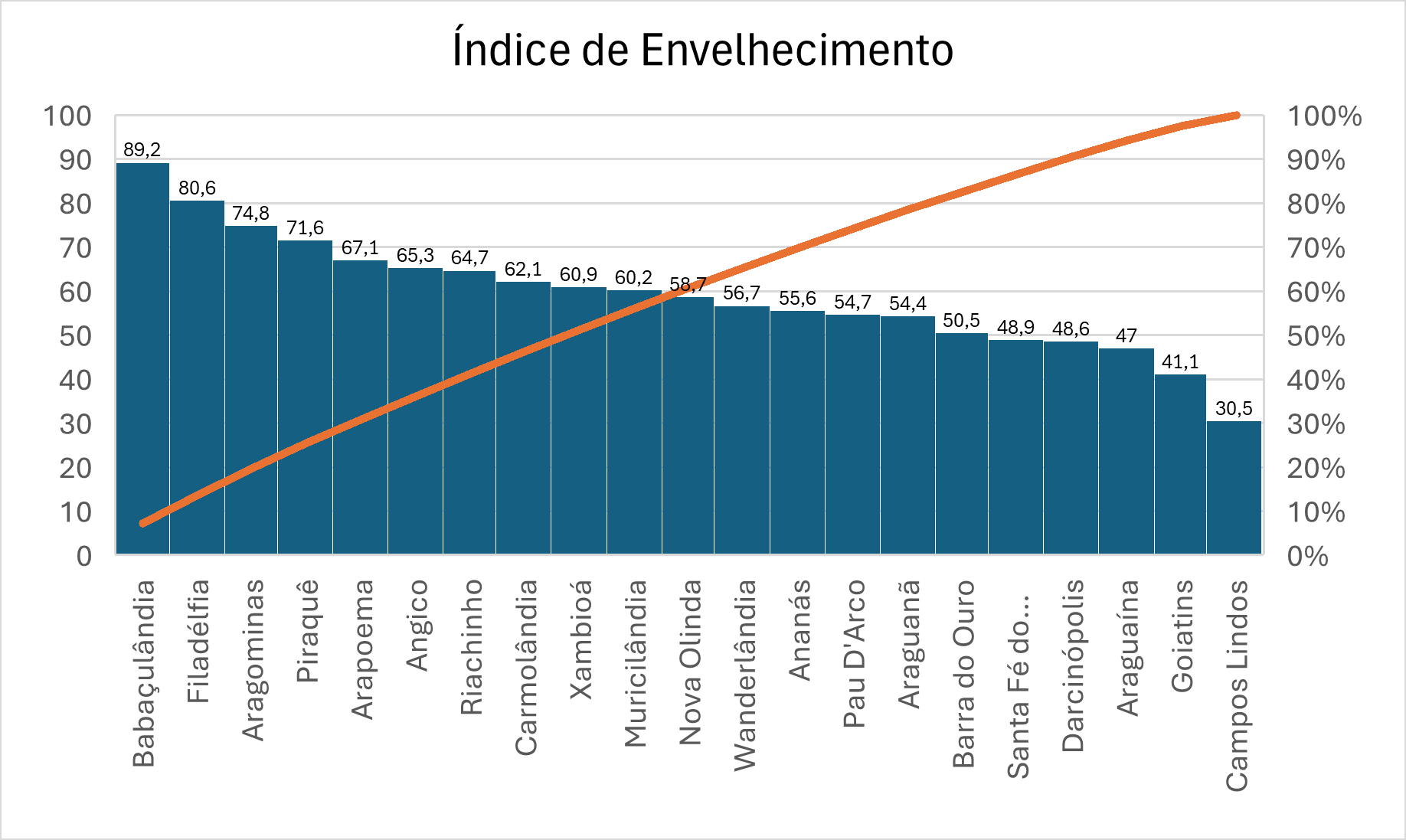 Babaçulandia também possui o maior Índice de Envelhecimento (IE) da Região de Influência Imediata de Araguaína (RIIA), conforme podemos observar no Gráfico 3. O IE foi calculado com base nos dados do DATASUS (2022) para idosos a partir de 60 anos.