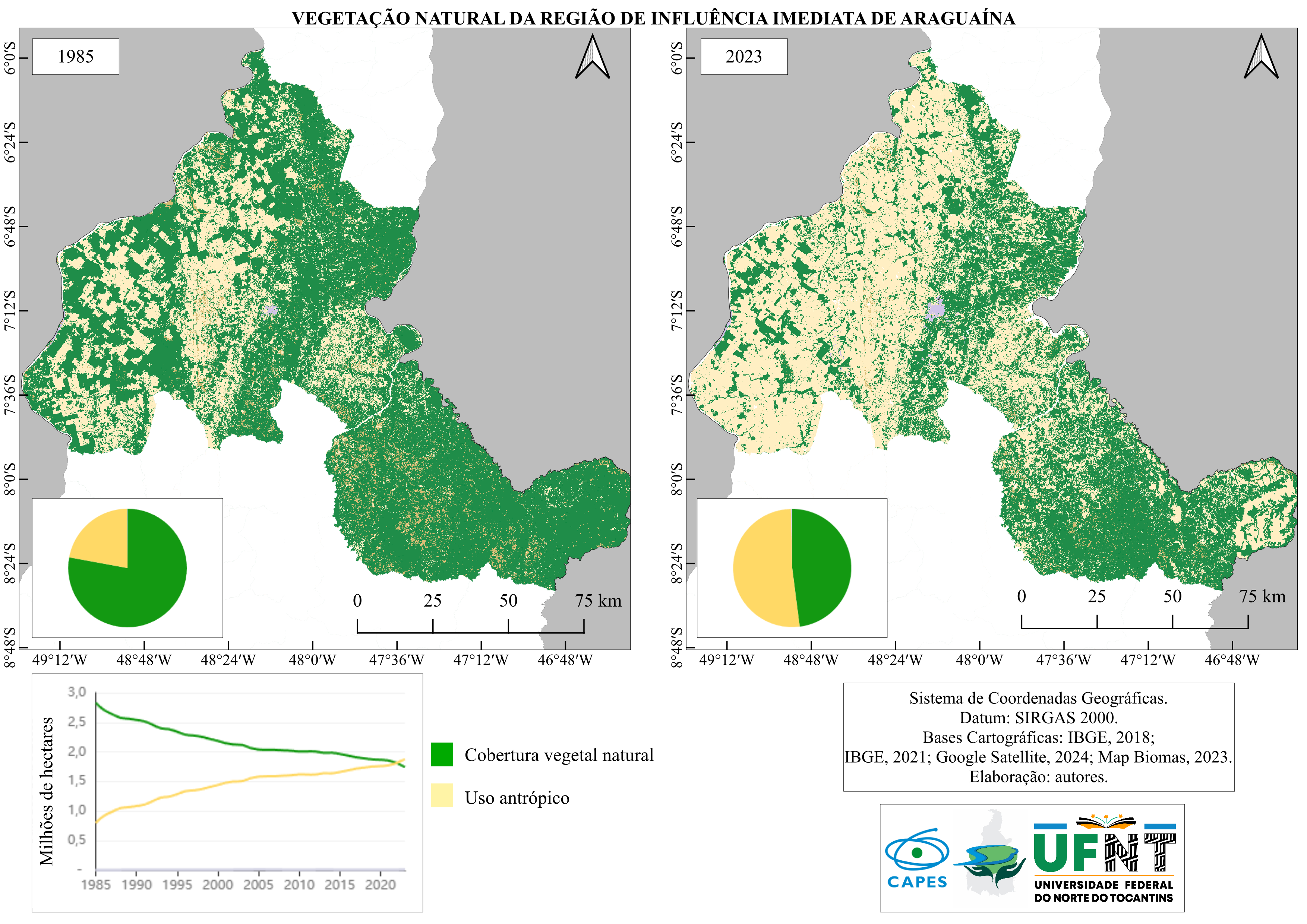 O município de Campos Lindos, apresenta a menor taxa de arborização em via pública da região, com apenas 11,7%. Adicionalmente, o Mapa 2 detalha a evolução da vegetação natural na RIIA no período de 1985 a 2023, utilizando dados fornecidos pelo Map Biomas Brasil (2024).