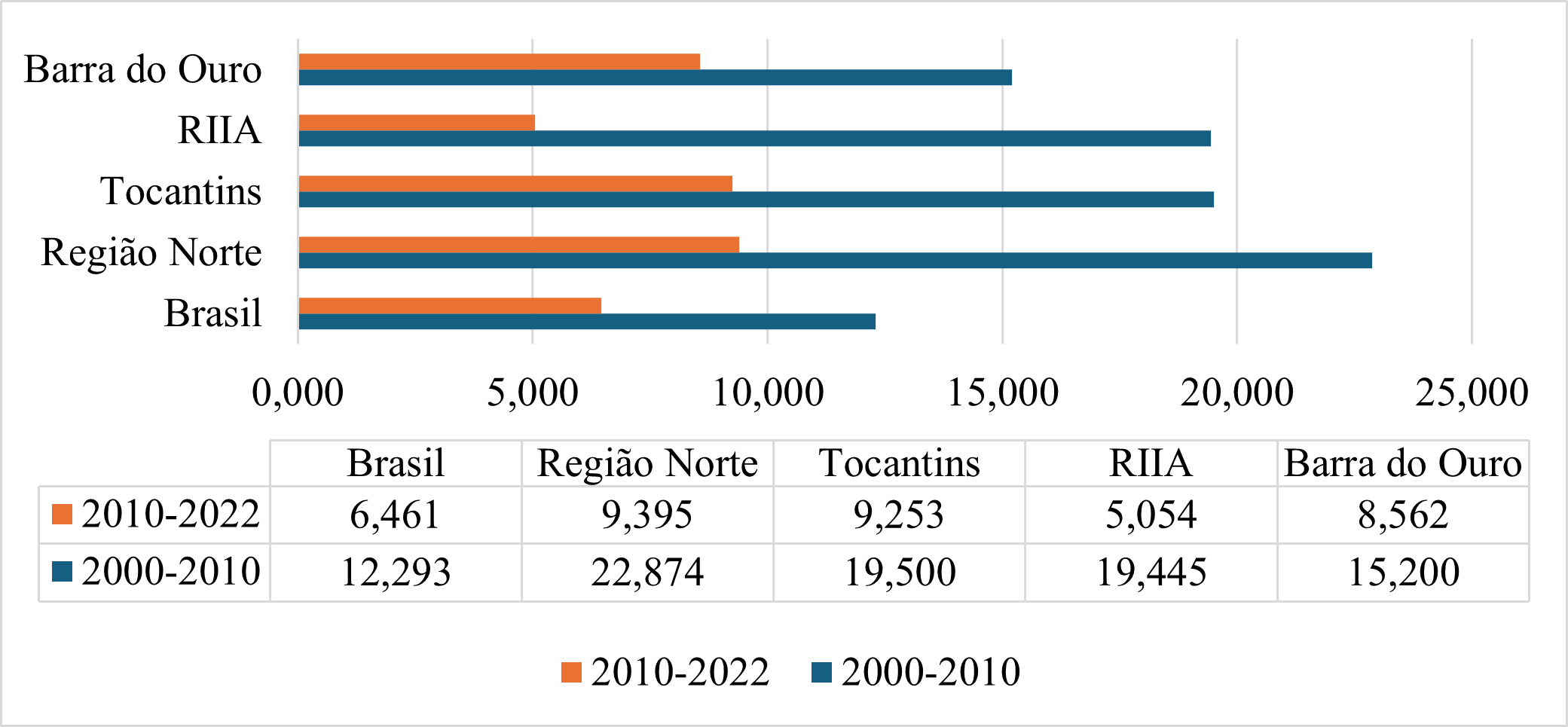 A segunda tendência, observada no período de 2010 a 2022, é a de uma forte e abrupta desaceleração. A taxa de crescimento de Campos Lindos caiu para apenas 6,3%. Este declínio drástico (uma redução de 38,1 pontos percentuais) indica que o ciclo de crescimento explosivo se encerrou, levando a uma convergência com o cenário demográfico brasileiro. No período mais recente, o crescimento do município (6,3%) alinhou-se perfeitamente à média nacional (6,5%). Contudo, Campos Lindos perdeu o dinamismo que o caracterizava em relação aos seus vizinhos, crescendo abaixo das médias da Região Norte (9,4%) e do Tocantins (9,3%), embora ainda se mantivesse ligeiramente superior à sua RIIA (5,1%). O Gráfico 2 apresenta a taxa de crescimento populacional comparativa entre os municípios que compõem a RIIA.
