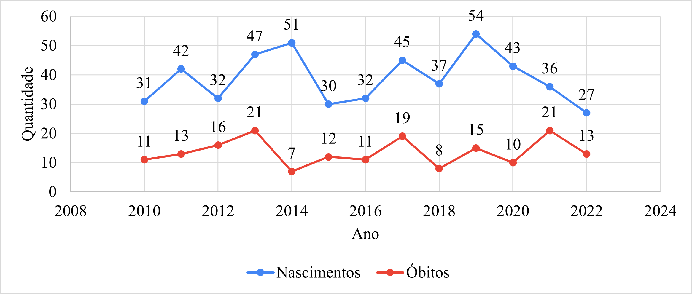 Apesar da consistência do saldo natural, a tendência de nascimentos mostra forte instabilidade e uma queda acentuada nos últimos anos. Após atingir seu máximo em 2019 (54 nascimentos), os números caíram progressivamente, chegando ao mínimo da série histórica em 2022 (27 nascimentos).