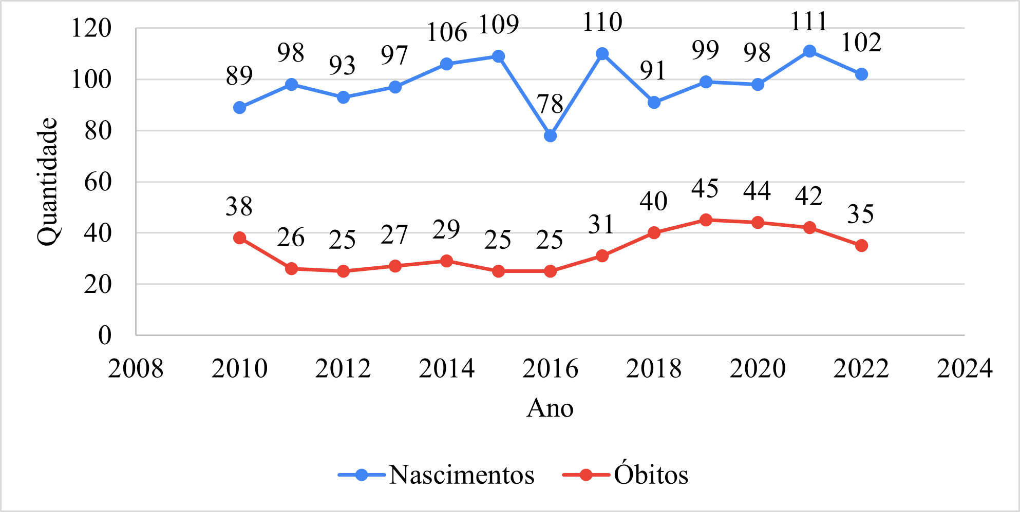 Observamos que o número de nascimentos manteve-se predominantemente alto, com picos de mais de 100 nascimentos em 2014 (106), 2015 (109), 2017 (110), 2021 (111) e 2022 (102). O menor número de nascimentos registrado no período foi em 2016 (78). Em contraste, o número de óbitos permaneceu consistentemente baixo, variando entre 25 (em 2012, 2015 e 2016) e 45 (em 2019). O maior saldo vegetativo (nascimentos – óbitos) ocorreu em 2015 (84 pessoas), e o menor, em 2019 (54 pessoas).