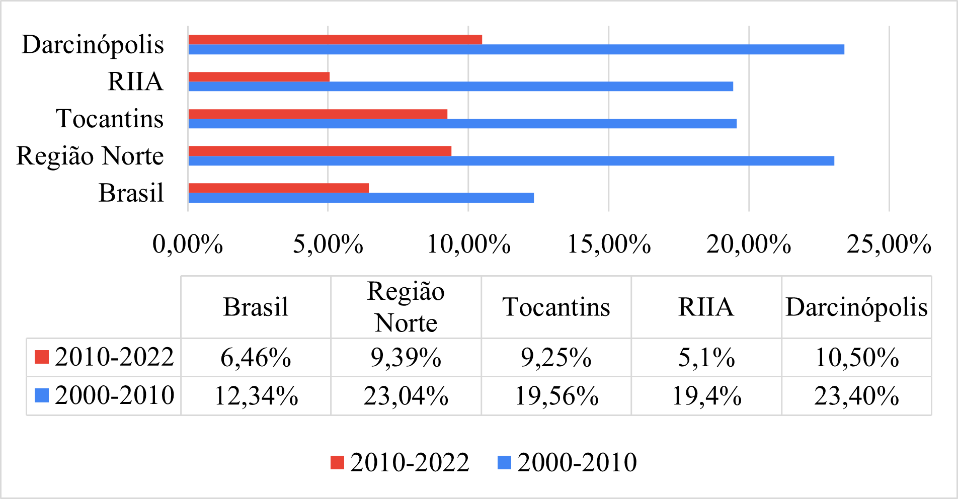 No período subsequente (2010-2022), a tendência se manteve, com Darcinópolis crescendo 10,50%. Este valor novamente excedeu o crescimento das demais regiões, como a Região Norte (9,39%) e a RIIA (5,1%), conforme a comparação do crescimento populacional no Gráfico 1 abaixo.