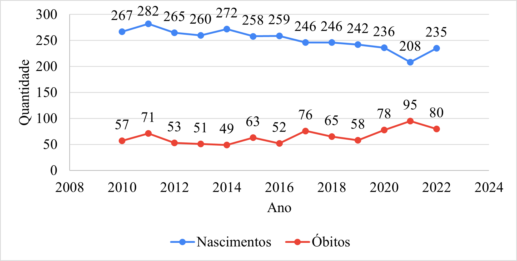 Quanto aos óbitos, a tendência geral é de aumento ao longo dos treze anos analisados. Nos primeiros anos, as mortes variaram entre 49 e 71. No entanto, é notável o aumento nos últimos três anos do registro (2020-2022), coincidindo com o período da pandemia de COVID-19, onde os óbitos atingiram seus picos: 78 em 2020, o máximo de 95 em 2021 e 80 em 2022. O aumento da mortalidade, especialmente nos anos recentes, contribui significativamente para estreitar a diferença entre nascimentos e óbitos.