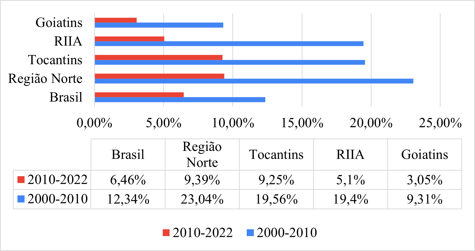 No período inicial (2000-2010), tanto o estado do Tocantins (19,56%) quanto a Região Norte (23,04%) apresentavam um dinamismo muito superior à média nacional (12,34%). A RIIA refletia esse vigor, crescendo a uma taxa de 19,4%.
