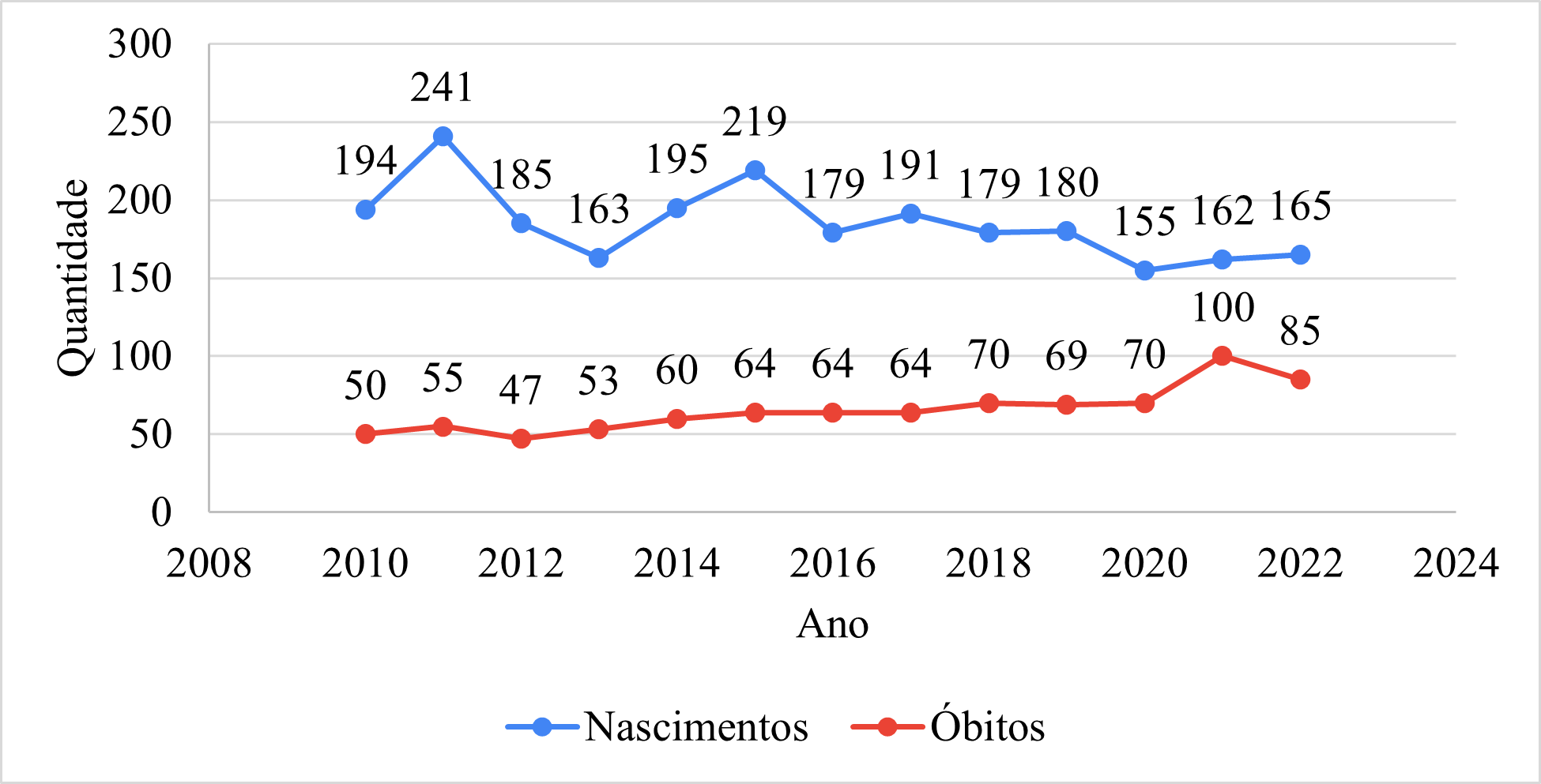 Em relação aos nascimentos, o período inicial (2010-2015) apresentou uma oscilação significativa, com um pico notável em 2011 (241 nascimentos) e 2015 (219 nascimentos), contrastando com um valor mais baixo em 2013 (163 nascimentos). Após 2015, a tendência geral se move para uma estabilização ou leve declínio, com os números de nascimentos se mantendo predominantemente abaixo das 200 ocorrências anuais. O menor número de nascimentos registrado ocorreu em 2020 (155), coincidindo com o início do período pandêmico, e permaneceu em patamares baixos nos anos subsequentes (162 em 2021 e 165 em 2022).