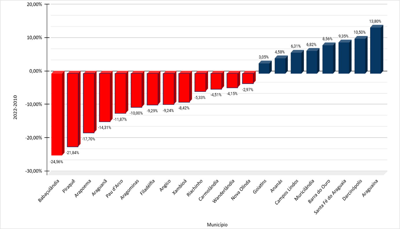 O Brasil, como um todo, viu sua taxa de crescimento cair de 12,34% para 6,46%. Embora a Região Norte e o Tocantins tenham mantido um crescimento acima da média nacional em ambos os períodos, o ritmo de expansão também diminuiu drasticamente, com o Tocantins, por exemplo, reduzindo sua taxa de 19,56% para 9,25%. Essa tendência de desaceleração indica que o forte dinamismo populacional observado no estado está em declínio, refletindo as mudanças demográficas nacionais.